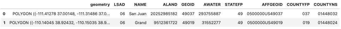 In the example above, invoking the collect() method returns a GeoPandas.GeoDataFrame containing rows (counties) that intersected our AOI. Since we did not set the columns option, all columns will be returned.